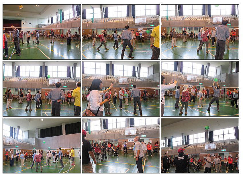 風船バレー 風船によるバレーボール サーブは下から、トス3回以内に入れるとアウト ついつい頑張ってファインプレイをしてもアウト。 風船はフワフワ・・・思うようにいかない、う~ん 難しい。
