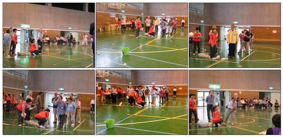 山の集い・銀輪の集い 写真集 玉入れ 数メートル先のバケツに布製の玉を投入れます 10個のうち見事入ったのは?