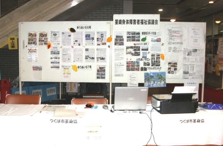 | 公民館ホールにて「茎身協ホームページ」と会報「ゆうあい」をパネルにて紹介。 会報「ゆうあい」は来場者に配布し、障害者、高齢者福祉への関心を呼びかけました。 5日にはリサイクルセンターでタオルの販売を行い、好評のうち半日で完売しました。 市民ホールでは、一部の会員がウクレレほかに出演しました。 |