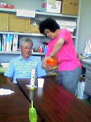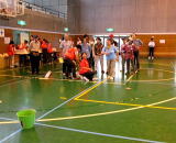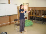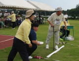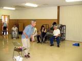 | 右原副会長の指導で皆さん初めての挑戦。力め過ぎたり届かなかったり意外と難しい。 パーフェクトはいなかったが、皆さん夢中になりいい汗をかきました。 休憩はコーヒーやお茶を飲みながら談笑もはずみ楽しいひと時でした。 |