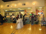 | 保健センターの保健師さんによる血圧測定から開始。会員16名の他、デイサービス利用者も参加され、笑顔と歓声満載のサロンでした。まず首や肩など、静かなストレッチ、腕や肩、足、手指などをゆっくり無理のないように動かし、たのしく健康体操を行いました。又、軽いボールを使い、ボールの伸縮性を利用した運動など、参加者は皆楽しそうでした。 | |||