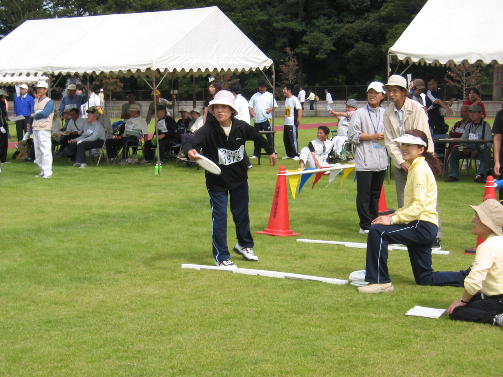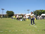 | 晴天で陽射しが強く少々暑さも感じられた一日。 全員「フランイングディスク」競技に参加し、さわやかな汗を流しました。 色別のゼッケンを胸につけ、ファイト満々! 期待通りに力一杯のフォームで健闘した会員。 力及ばず、「あれ〜?こんなはずじゃなかった・・・」なんていう表情の会員。 それなりに頑張った一日でした。 参加者14名 |