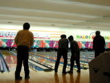 | 会員の自家用車による送迎で、無事実施できました。 1レーン3人づつで5レーンに別れ、ほぼ一時間ほどで2ゲームを終了 ミーティング室で食事のあと、成績発表・表彰を。 今回は優勝(新田さん)・準優勝(中山さん)・第三位(村田さん)・ブービー賞(塚田さん)の他に ベストグロス賞・ラッキーセブン賞・イレブン賞・のんびり賞を設定しました。 参加者14名 |