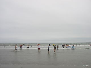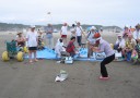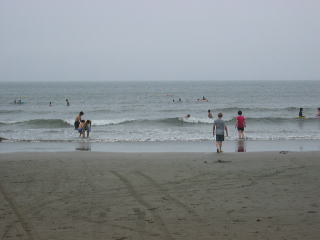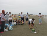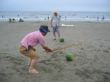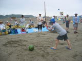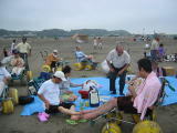 | 天気予報では雨の確立大とあり、不安の中の実施でしたが雨は大丈夫! でも風が強く砂けむりで顔や目をかばう状態。やはり今年も用意したパラソルは広げませんでした。 お弁当もシートを海寄りに移してやっとホコリをよけて食べる始末。 スイカ割りのあと、早々に海を切り上げ、お魚市場へと。 市場の方にスイカを切っていただき、みんなで食べました。 今回は詩吟の会の皆様と同行、お陰さまでバス内は歌声で盛り上がりました。 参加者27名 |